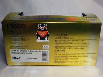 2021年2月10日17時よりエブロオフィシャルショップにて予約が開始され、2021年2月24日に発送開始、自宅には2月27日に届いた。チャンピオン獲得を記念したゴールドパッケージ仕様。 2019年6月14日に受注が開始され、2020年8月19日に発売された同じレイブリックの2018年仕様であるNo.45628より、あとに企画されたものだと思われるが品番が若いのが謎。ARTAのNo.45629に対するNo.45618と同様に、最終戦仕様に変更された商品と思われる。 No.45628との大きな違いは、ルーフがボディーの多くの面積を占めるレイブリックブルーではなく、差し色のメタリックライトブルーに変更されている点。他にもリアフェンダー後部にくまモンが追加されるなど小変更が見られる。 支払い方法としてクレジット払いができず、代金引換のみというのが少々面倒だが、一人様1台限りしか注文できなかったためヤフオクで高騰した(2月26日出品28日終了→25,000円、2月27日出品28日終了→23,500円、2月28日出品28日終了25,000円)。送料・代引き手数料込で12,740円の商品なので転売価格はほぼ2倍である。 3月3日にも22,000円での落札があり、3月6日現在も3点が2万円以上で出品中で、うち2点には入札がある。 2020年の冬に発売予定だったNo.45621の通常パッケージ版(2020年9月3日受注開始)が同時発売になるかもしれないと予想していたが、3月6日現在発売されていない。 この特別仕様バージョンは、パッケージがチャンピオンモデル特別仕様のゴールドになるのみならず、台座も特製のシルバーメッキ仕様になっていて豪華なのだが、白いテープ状の台座ラベルがややチープで浮いた感じがするのが若干気になる。 通常版の受注時に「特別パッケージ入り」を宣伝文句にしていたので、通常版は、パッケージは共通のゴールドでパッケージ内の背景画像と台座だけ変えてくるのではないかと私は予想していたのだが、背景だけ変更した別の商品が先に発売されることになった。 前述したNo.45628のチーム国光オリジナルスペシャルパッケージが9月にauto sport web shop限定で発売されているのだが(私は買いそびれた)、今回もauto sport web shop限定パッケージが発売されることが2021年3月2日にツイッターで告知された 。 予約受付が2021年3月5日17時からということで、今度こそ買いのがしはできないと気合いを入れていたら、なんとまさかの抽選販売であった。昔の限定Gショックや最近の人気ゲーム機などではありがちな販売方法だがNSXミニカーでは初めてかもしれない。受付期間は2021年3月10日10時まで。 |