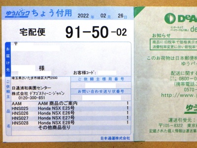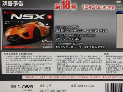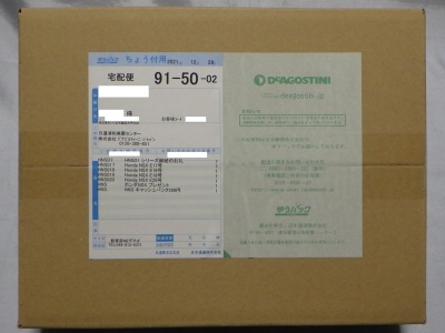 2021年12月23日に、定期購読のエコパッケージで同じものが2セット届くことになったため1つを解約手続きしたが、解約が間に合わなかった1月4日に届けられる予定だった17〜20号のセットが、予定より早く2021年12月30日今朝9時頃届いた。 解約手続きに12日かかると聞いていたので間に合うと思っていたのに間に合わなかったのはこういうことだったようだ。 全く同じものが2セット届いたのかと思いきや、箱のサイズは同じであったが、貼られている伝票が微妙に異なっていた。 試験販売版の契約者番号が記された方の箱には「シリーズ継続のお礼」「ホンダNSXプレゼント」「キャッシュバック500円」の記載があり、全国版の契約者番号が記された方の箱には「ホンダNSXプレゼント」「その他商品在り」の記載があった。 両方を開封して中身を確認してみたところ、両方に共通していたプレゼントとは、全国版の公式サイトにWebからの定期購読申し込み特典として掲載されていた「オリジナルクリアファイル」であった。 「キャッシュバック500円」は、エコパッケージになったことで正規のパッケージをなくしたのに支払額が変わっていないお詫びに500円分の郵便為替でも同封してきたのかと思いきや、「シリーズ継続のお礼」の文書に口座からの引き落とし額を500円減じる旨が記載されているだけであった。 お詫びなのかお礼なのかよく分からないキャッシュバックで、全国版の方にはないのも謎。 ちなみに全国版の方の「その他商品在り」は、単にデアゴ製品の宣伝チラシが5種ほど入っているだけであった。 第17号の本来の発売日は12月14日(火)。パーツの内容はトランスミッションポンプなど。 第18号の本来の発売日は12月14日(火)。パーツの内容は エンジンジェネレーターなど。 第19号の本来の発売日は12月27日(月)。パーツの内容はエンジンの補機 。 第20号の本来の発売日は1月4日(火)。パーツの内容はエンジン ホルダーアームなど。 |