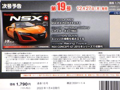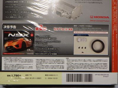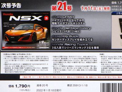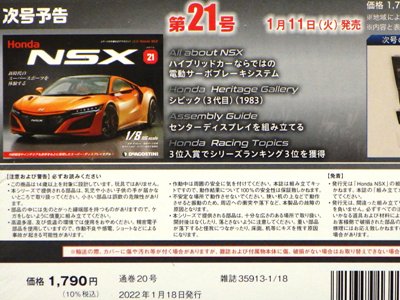 2022年2月1日に到着。 通常パッケージ版の21〜24号は、25〜28号 と一緒に2月5日にヤフーショッピングで書店に注文。 8冊セットでの注文だと、合計金額が1万円を超えて送料が無料になるため。 今回は有料オプションでNo.21に同梱されるはずだった歴代NSXハイクラスモデルカーコレクション第1回のNA1フォーミュラレッドが同梱されていた(この商品の詳細は「メイクアップ」コーナーへ)。 No.21の不良パーツ混入についての案内も同梱されていたが、届いたものには問題のないパーツが入っていた。 第21号の本来の発売日は1月11日(火)。パーツの内容は センターディスプレイ。 第22号の本来の発売日は1月18日(火)。パーツの内容は ダッシュボードミドル。 第23号の本来の発売日は1月25日(火)。パーツの内容は グローブボックスリッド、センタースピーカーメッシュ。 第24号の本来の発売日は2月1日(火)。パーツの内容は グローブボックス。 |