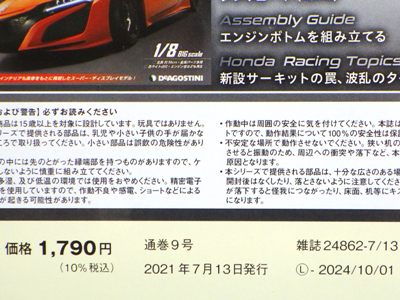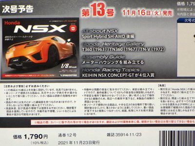 2021年9月5日午後に第3号と一緒にゆうパックで配達された。 第2号(9月14日号)の本来の発売日は8月31日(火)である。 第3号(9月21日号)の本来の発売日は9月7日(火)である。 試験販売版も販売は続いており、9月8日現在も、販売中の11号か、次号の12号から定期購読の申し込みが可能で、バックナンバーも購入できる。 この全国版であるが、創刊号同様、基本的に日付け関係以外パッケージデザインは試験販売版と同じで、付属冊子の中身も若干レイアウトが変わっているくらい。 冊子の大きな変更は「歴代NSXハイクラスモデルカーコレクション」の宣伝ページが追加されている点。 メインのミニカーパーツにも変更はないが、パーツリストに記されているパーツ名のところに、金属製パーツには「(金属製)」の表記が追加されているのが地味な変更点。 |