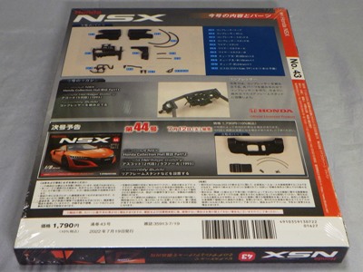2022年6月26日に到着。 歴代NSXハイクラスモデルカーコレクション第4回NSX-R(NA2)と第5回の広告チラシも同梱。 第38号の本来の発売日は5月31日(火)。パーツの内容は左リアブレーキディスク。 第39号の本来の発売日は6月7日(火)。パーツの内容は右リアサスペンション。 第40号の本来の発売日は6月14日(火)。パーツの内容は右リアブレーキディスク。 第41号の本来の発売日は6月21日(火)。パーツの内容はリアタイヤ。 第42号の本来の発売日は6月28日(火)。パーツの内容はインタークーラー・スピーカー。 |