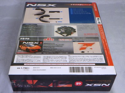 2022年7月24日に到着。 歴代NSXハイクラスモデルカーコレクション第5回NSX-R GT(NA2)も同梱。 第43号の本来の発売日は7月5日(火)。パーツの内容はコンプレッサー。 第44号の本来の発売日は7月12日(火)。パーツの内容はリアフレームスタンドなど。 第45号の本来の発売日は7月19日(火)。パーツの内容はラゲッジボックスなど。 第46号の本来の発売日は7月26日(火)。パーツの内容はリアホイールハウスなど。 |