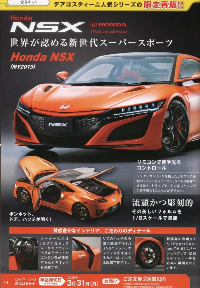 | 1/8 DEAGOSTINI(デアゴスティーニ)週刊Honda NSX(NC1)全国版 第34〜37号エコパッケージ版/各\1,790税込(\1,627+税) | |