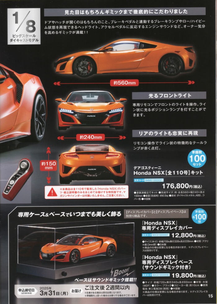 「週刊ホンダNSX-R」の定期購読優良特典として2024年11月17日に届いたデアゴスティーニ1/43「Honda NSX シリーズコレクション 第1回 Honda NSX Type-S 2021(カーボンマットグレーメタリック)」に同梱されていたカタログ。 表紙・裏表紙を含め(いずれにもページ数が振ってある)38ページの結構豪華なカタログで、14〜15ページに1/8「週刊ホンダNSX(2019)」の限定再販の広告があるため、NSXグッズ認定。 なお、デアゴスティーニでは完成品の販売もしているが、こちらはキット状態での販売。 マガジンやバインダーなどは付属しない、キットと組立説明書のみの特別セットのため、本来の110号分の定価195,600円(税込)より少し安め(約10%オフ)の176,800円(税込)となっている。 限定100セットの貴重なNSXグッズだが、店頭販売版とエコパッケージ版の2セットをすでに購入済みなので、さすがに手を出せない。 24ページには、なぜかオートアート1/18「NSX-R(NA2)チャンピオンシップホワイト」の紹介もされている。 「カタログ・書籍」コーナーに掲載すべきものだが、このNC1コーナーに掲載。 |