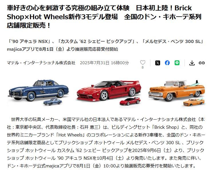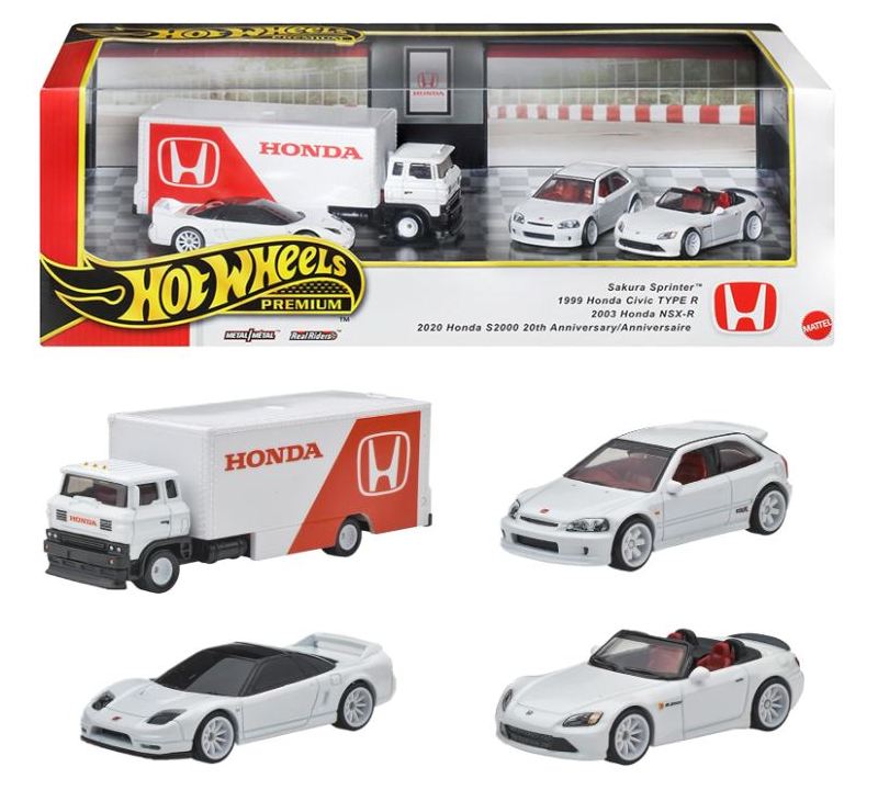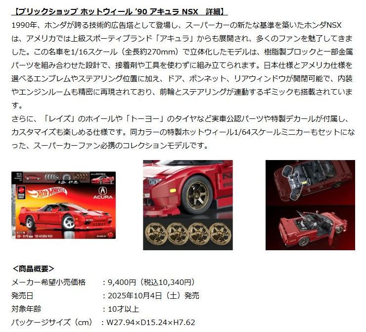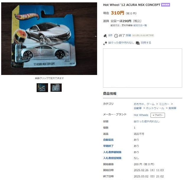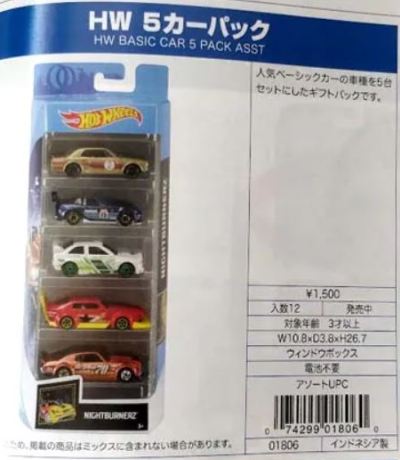 2024年8月23日に未知の「ホットウィール マルチパック9」が初登場し無事落札。 含まれているNSXは2022年9月に登場した「'90ACURA NSX イエロー J-IMPORTS(RYU'S RIDES)」で、直前に落札したマルチパック5に含まれていた'17ACURAのように、特別仕様というわけではなさそう。 NSXの他には先代のフェアレディZ(Z34・これは特別仕様っぽい)と先々代シビックタイプR(FK2)が確認できるが、そ れ以外の車種はよく分からない。 同じ'90ACURAのイエローモデルであるNIGHTBURNERZを含むマルチパック9は、2019年1月にe-bayで見たことがあるが、送料を含めると7,000円近い価格でとても手が出せなかった。今回は送料を含め2,280円だった。 |