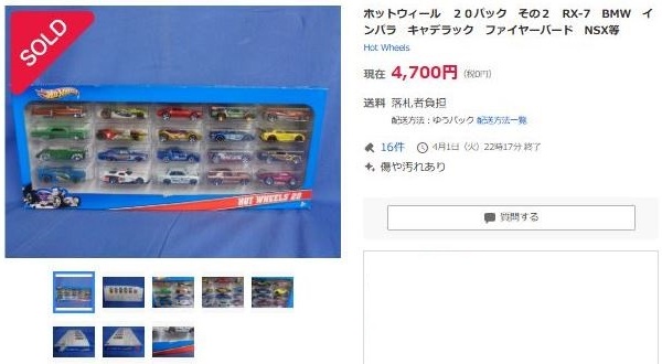 2020年1月25日ヤフオク初登場。2019年発売の各種マルチパック限定モデル。 特に珍しいものではないのか、他に入札者は現れず落札することができた。 未開封のためミニカー裏板の刻印は不明。 |