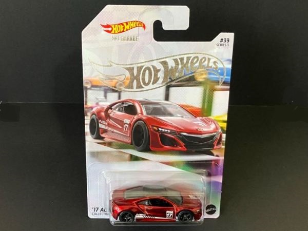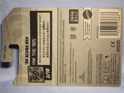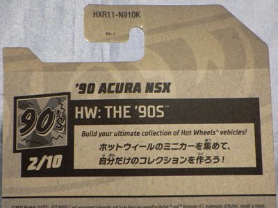2018年4月28日にヤフオクに初登場した「MONTH2018」のシールの貼られた「’90ACURA NSX SILVER」を落札し入手。 2017年9月に「'17ACURA NSX YELLOW」で、同様のデザインの「MONTH2017」マークがパッケージにプリントされたものを入手したことがあるが、これはプリントではなく、シールが後から貼られている。 出品者によれば、アメリカのWALMARTで購入したもので、シールの位置はランダムだったとのこと。 7月に別の出品者から同じ入手して、それを確認した(購入したものはコレクション数にはカウントせず)。 どちらの商品もカードナンバーは「FJW10-D9C0Q」。カード刻印は「1917N」で、裏板刻印は「K29」だった。 |