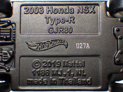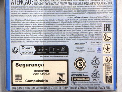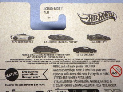 2020年4月19日にヤフオクに初登場した鈴鹿サーキットセーフティカー仕様のカラーバリエーションで、2020年9月30日にヤフオク初登場。 クロガー限定モデルということで海外から出品された。 過去にディスカウント百貨店チェーンのターゲット限定モデル、スーパーマーケットチェーンのウォルマート限定モデルがあったが、クロガーもアメリカのスーパーマーケットチェーン。 2020年10月に、福岡のW氏がアメリカ・オハイオ州から取り寄せた「Hot Wheels 2020 Kroger Exclusive White 90 Acura NSX Lot Of 4 JDM」を分けていただいた。 価格は送料込みで1台当たり1,068円。 裏板の刻印は「N28」。カードの型番は「GHG58-D9C0P」。 カード裏の刻印はなし。 |