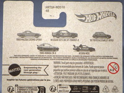 2023年2月4日にebayダイレクトショップで発見した新作。 2023年3月18日に正式に国内発売となった(amazonでの確認)。 シリーズ名はパッケージのどこにも記載がないが、「テーマオートモーティブアソート」と言う。 '98ホンダプレリュード、'91MX-5マツダミアータ、トヨタ2000GT、フェアレディ2000、そして’90アキュラNSXの5種となる。 NSXは2017年8月登場のファクトリーフレッシュ以来のシルバーモデル。 2023年3月16日にヤフオクに初登場したものを現地販売版だと思って、若干高めなのを気にせず落札したのだが、届いたものを確認したら、日本語シールの貼られた国内販売版であった。 桜を描いたと思われるパッケージ(5種共通)の美しさが大変印象的なモデル。 amazonの5種セットの参考価格が4,950円(実売価格4,528円)なので、1台あたり990円となるが、ヤフオクでは、2023年3月22日現在、5種セットが2,000〜2,500円、NSX単品が370〜680円で出品されている。 カードナンバー「HLK18-D510 4B」、カード刻印なし、裏板刻印「R52」であった。 後日同じ商品を入手したが、カードナンバーも裏板刻印も同じだった。 |
