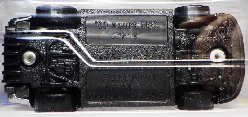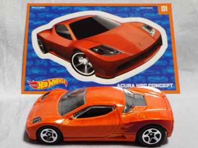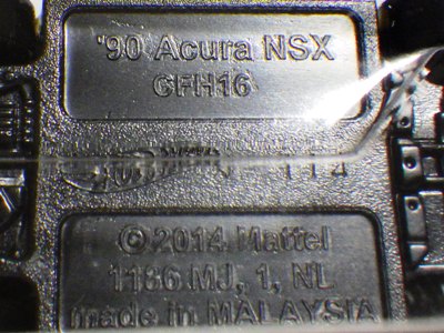 2014年にリリースされたミステリーモデルズ限定バージョンのオレンジモデルを2024年9月にヤフオクで入手。 2008年に登場するアキュラNSXのカスタム仕様シリーズにもこのようなブラインドパッケージのミステリーモデルズは存在したが、覗き窓付きの親切設計だった。 こちらは完全ブラインドとなっているため、欲しいモデルを引き当てるのが困難。 シールが付属している。 HSCシリーズは、このモデルから、マレーシア製からタイ製に変わっている。 商品名に「NSX」という名称がないため、毎日のヤフオク検索に引っかからず、入手まで10年もの時間がかかってしまった。 |