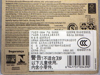 2008年6月購入。 2008年5月発売。 白タイプと異なりパッケージがショートカードとなって表裏共に日本語表記され完全に日本仕様になっている。 トイザらスでの販売価格は248円。 白黒ともに輸入元はマテル・インターナショナル株式会社で車自体に変更なし。 カードの品番は「N5934-0617」。 カードの刻印は「0408N」。 裏番の刻印はない。 |
