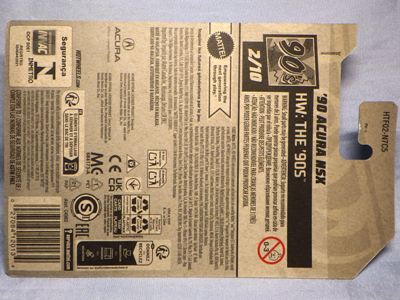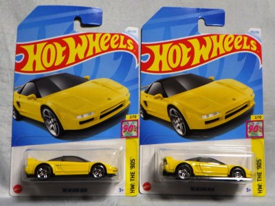 ホットウイールの新作は毎月第一土曜の発売で、2023年1月7日発売予定だったのだが、注文してあったショップから2022年12月29日にショップから届いた。 ホットウイールの’90 ACURA NSXイエローモデルは、2016年にNIGHTBURNERSシリーズで登場しており、デザインも似ているので注意が必要。 現地販売版は2022年9月7日にヤフオクに初登場し、入手済みのモデルでは、カードナンバー「HCX58-M7C5」、カード刻印「07-22」、裏板刻印「R28」であったが、今回の正規国内版は、カードナンバー「HHF60-M910N」、カード刻印なし、裏板刻印「R31」であった。 ブリスターパックの形状は、近年のセオリー通り、現地販売版がミニカーリア部の凸部分が広くなっているのに対し、フロント部が広くなっている。