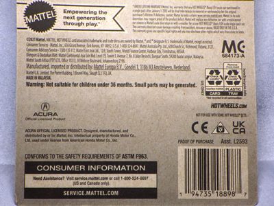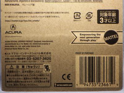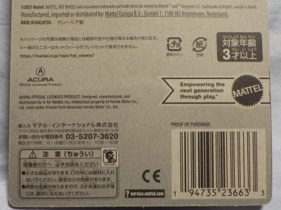 2020年4月にヤフオクに初登場した時は、日本語シールが貼られた正規輸入版は出回っておらず、現地販売版(並行輸入版)のみが流通し、それを入手したのだが、その後いつの間にか正規輸入版が発売されていたようである。 (ヤフオクの商品紹介画像では、裏面までなかなか載せてくれないので、正規輸入版の発見が遅れることが多い。) オモテ面のフック部分に違いがあるが、裏面は完全に異なっており、カード番号も違う。 現地販売版にあったカード裏の刻印はなく、ミニカーの裏板の刻印は「N08」から「N10」に変わっている。 ブリスターパックの形状もNC1のグリーンモデルやワイルドスピードのNSX-R同様に違っている。 カードの型番は「GHC32-D7C5」。 |