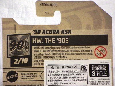 2022年7月に入手。 「NIGHTBURNERZ」シリーズの'90ACURA NSX イエロータイプは、カードナンバーで言うと「DTY78-D7B3」、そのマイナーチェンジ版「DTY78-D9B0D」の2種に、ショートカードの「DTY78-D5B6」の計3種を入手していたのだが、「D7B3」に日本語シールが貼られたものと、韓国語シールが貼られたものを新たに入手。 裏板の刻印はショートカードのみ「J45」で、あとはすべて「J42」だったが、「D7B3」カードで裏板刻印が「J44」のミニカーが入った商品も所有している。 カードの刻印はどちらも「2836N」で、最初に入手した「D9B0D」カードと同じなのが不思議。 |