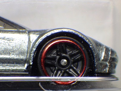 2017年9月28日にヤフオクに出品されたファクトリーフレッシュのシルバーの画像が、先に入手していたものと異なっていたので落札(左の画像の右側がその入手品)。 カードの表面は全く同じなのだが、裏を返すと右側のフック部分のナンバーに「G1」の文字が追加されている(下の比較画像参照。以降右列が今回の入手品、左列が先の入手品の画像)。 コード番号の文字が追加されているということは、どこかに仕様変更があったはずなのだが、どこが異なっているのか見つけることができなかった。 刻印は「1987N」から「2197N」に変更されている。 ミニカーの裏板の刻印も「K29」から「K32」に変更されている。 ナンバープレート部分のホットウィールのロゴがなくなっているのも変更箇所かと思ったら、どうもリアのタンポ印刷が大きく下にずれているだけのようである。リアのガーニッシュ部分へのタンポ印刷が、その下のバンパー部分にプリントされてしまっているのが分かる。 |