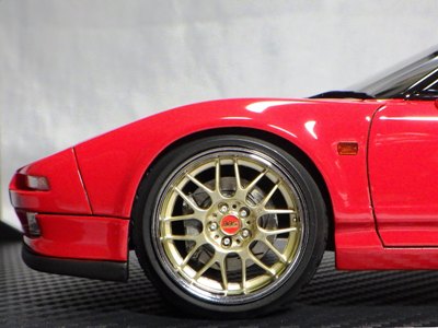 イグニッションモデル初のNSXミニカーとして2016年4月にIGN405ブラックと共に発売予定だったIG0400レッドが、402シルバーと403ホワイトに遅れて3番手として登場。2016年8月23日にメーカーから問屋へ向けて出荷され、メーカーとしては店頭で26日発売を予定していたようだが、25日にはヤフオクでの出品がスタート。Amazonに注文していた自分の所には27日の午前中に届く。生産台数180台(ショップによって200台と記載されている場合も)。ゴールドのBBS LM18インチホイールが印象的な1台。 |