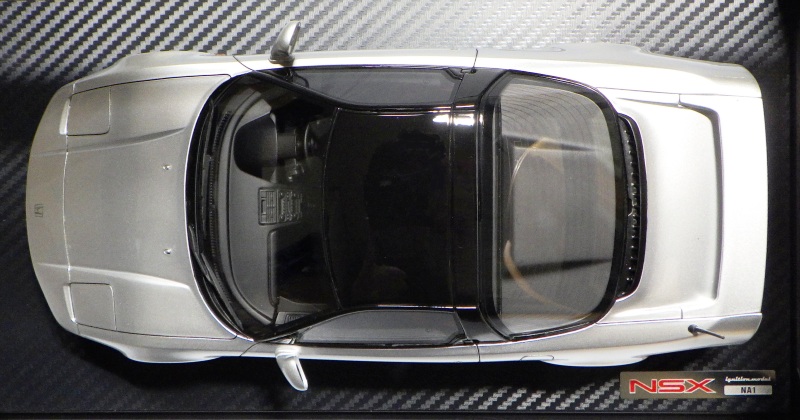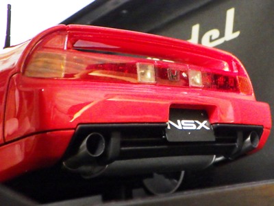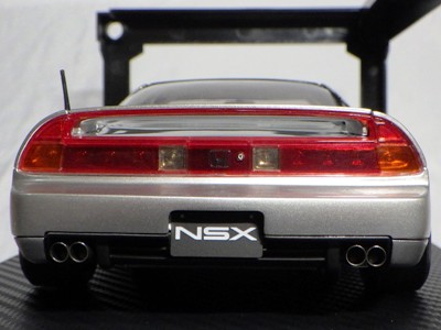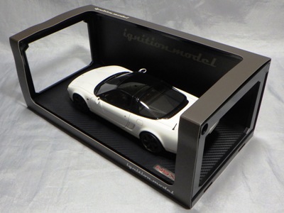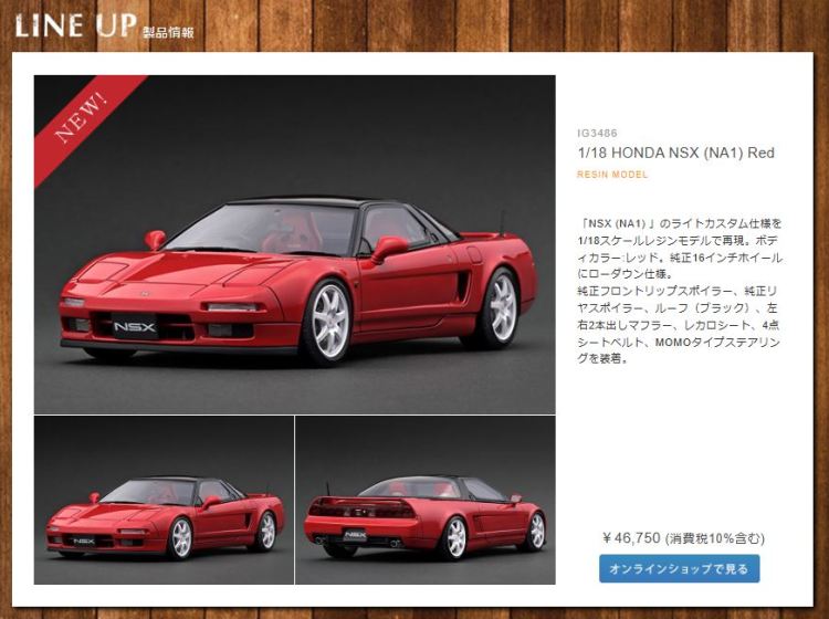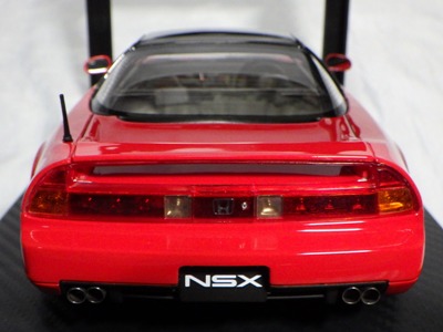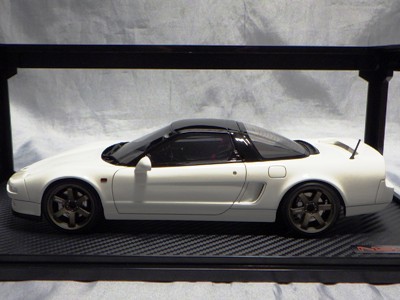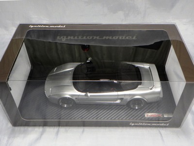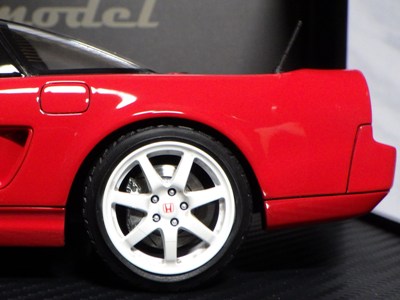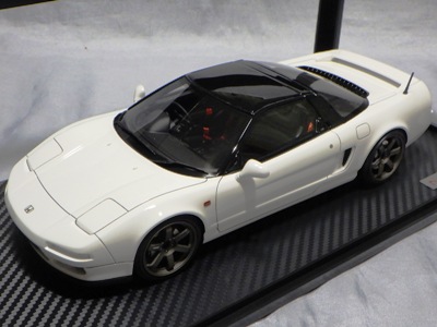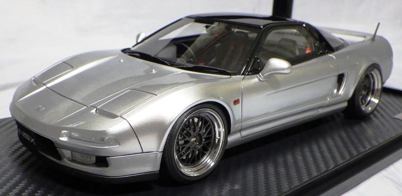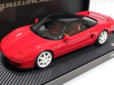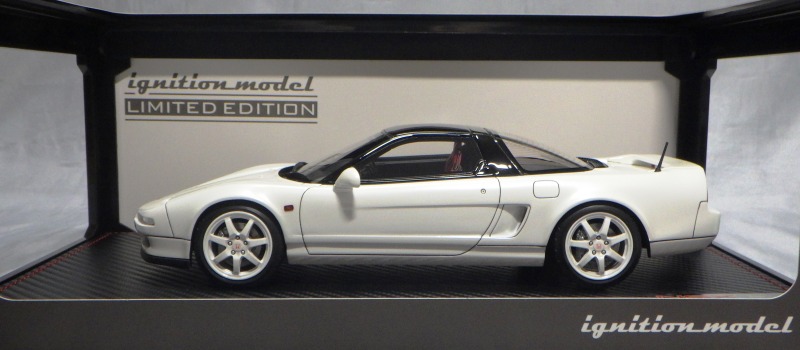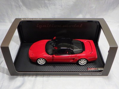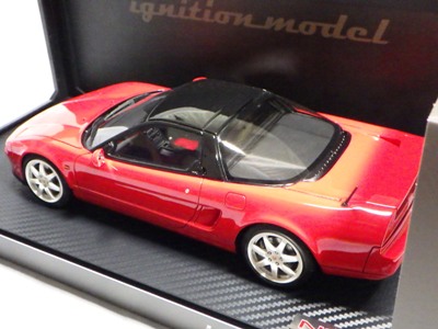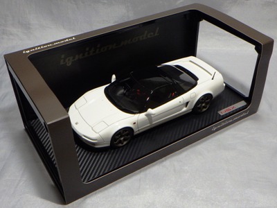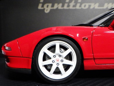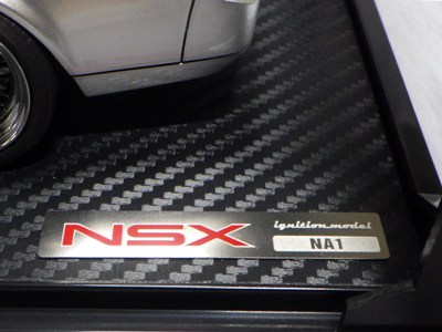 | 2017年5月28日(ヤフオクでは27日初登場)、イグニッションモデル初の1/43NSX5種(「IG0927NSX(NA1)レッド」「IG0928NSX(NA1)シルバー」「IG0929NSX(NA1)ホワイト(18inTE37タイプホイール)」「IG0930NSX(NA1)ホワイト(18inBBSタイプメッシュホイール)」「IG0934NSX(NA1)レッド・カーボンボンネット」が同時に発売された( 「IG0933NSX(NA1)ブルー」 「IG0932NSX(NA1)イエロー」 「IG0931NSX(NA1)ブラック」は6月23日発売)。墨入れが少々きつめで、フェンダーのエッジは立ちすぎだが、1/18で見せたクオリティの高さはそのまま。かつてない革張りの台座が何とも言えない高級感を醸し出している。生産台数150台。 | ||||||||||||||||||||||||||||||||||||||||||||||