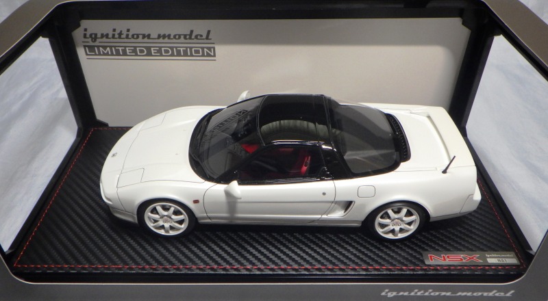 | 2017年5月28日(ヤフオクでは27日初登場)、イグニッションモデル初の1/43NSX5種(「IG0927NSX(NA1)レッド」「IG0928NSX(NA1)シルバー」「IG0929NSX(NA1)ホワイト(18inTE37タイプホイール)」「IG0930NSX(NA1)ホワイト(18inBBSタイプメッシュホイール)」「IG0934NSX(NA1)レッド・カーボンボンネット」が同時に発売された (「IG0933NSX(NA1)ブルー」 「IG0932NSX(NA1)イエロー」 「IG0931NSX(NA1)ブラック」は6月23日発売)。墨入れが少々きつめで、フェンダーのエッジは立ちすぎだが、1/18で見せたクオリティの高さはそのまま。かつてない革張りの台座が何とも言えない高級感を醸し出している。生産台数160台。 | ||||||||||||||||||||||||||||||||||||||||||||||