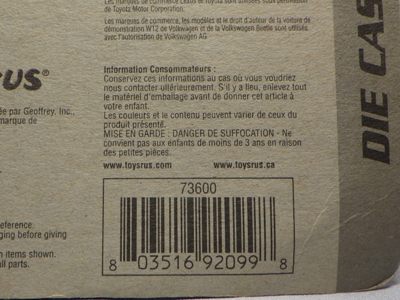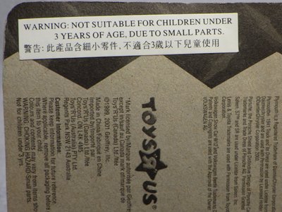 | 2008年3月ヤフオクにて購入。出品者は2006年頃通販で購入したとのこと。箱はトイザパッケージとは若干デザインが異なる。箱の耳に「04年4月」といった中国語の記載が見える。トイザ版同様に稀少。 | |