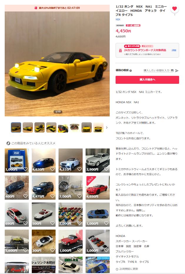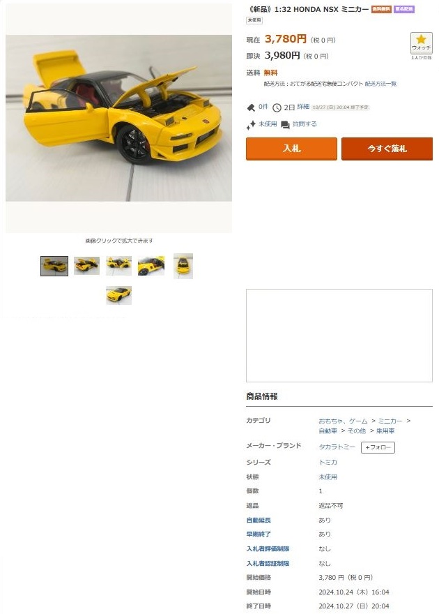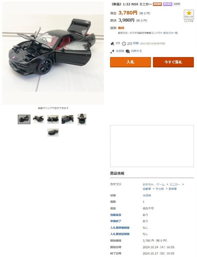 2024年8月9日からamazonで販売が開始された謎の中国製ミニカーJUANAI (ちさ) 1/32「ダイキャストカーモデル アキュラNSX シミュレーション音と光プルバックギフト」。 サービスエリアの売店やファミレスのレジで500〜980円くらいで販売されているようなレベルに見えるミニカーが4,000円以上で販売されていたので見送っていたのだが、2024年12月末現在も同じ画像を使った商品は、ヤフーショッピングで、ブラック、レッド、ホワイト、ブルーの4色が3,971円(送料無料)で販売されているものが見られる。 amazonではSHENというブランドで2,999円(送料無料・2020年3月25日取扱開始)で販売されているものが同じ商品に見えるので、そろそろ買ってみてもいいかなと思っているのだが、2017年にヤフオクにセットものが初登場し、2019年にトイザらス店頭に登場したB.A.R.T.E.R.香港LimitedがMSZ VROOM TECHブランドで1,078円で販売されたものと同じではないかと思い始め、未だに購入に至っていない。 そうこうしているうちに2024年10月22日にヤフーフリマに初登場(ヤフオクでは10月24日)したのが、上記のNC1ミニカーと同じようなギミックを持ったNA1のミニカー。 こちらも相場は4,000円前後と、上記のNC1ミニカーと同じくらいだったのだが、NC1ミニカーのように他に似たような商品はなかったので、とりあえず試しにレッドのみ、11月中旬にヤフオクで落札した。 1/32スケールで全長は約15cm、ボンネット、リトラクタブルヘッドライト、リアハッチ、両ドアが開閉。 電池(LR44ボタン電池×3個)のセーフティを解除していないので確認していないが、車体後部を下に押し込むと、ヘッドライトとテールランプが点灯し音が鳴るらしい。 確認するのを忘れたが、シートもリクライニング可能。シートが可動するNSXミニカーはおそらくこれが初。 イエロー、シルバー、ブラックを含めた全4色が用意されており、4,000円前後の価格もやむなしと思えるくらいの質感はある。 私はヤフオクで3,980円(送料無料)で入手したが、amazonでは1万円前後で販売されているものも多数あるので購入時には注意が必要(最高値は19,690円!)。 |