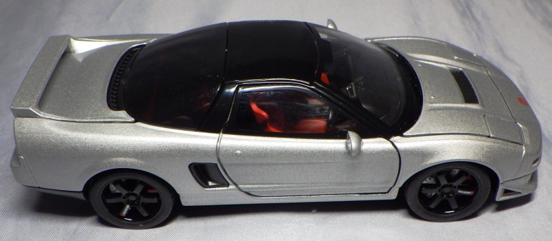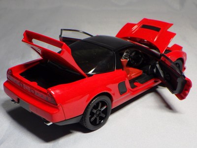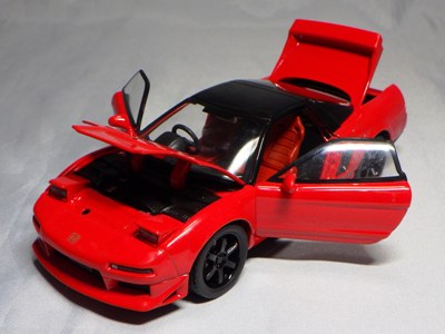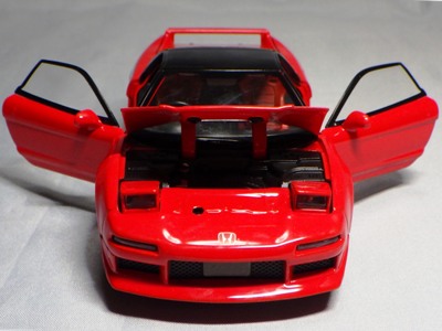 | オークションにて購入。組立式で単3電池2個(別売)とモーターで走行可。スケールは1/40。 | 2002年9月上旬発売。トランスフォーマーシリーズのロードポリス。どこにもNSXという記載はないが明らかに形はNSX。車形態時の全長約55mm。 | ||