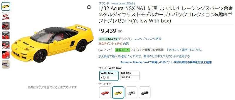 「ダイキャストカーモデル アキュラNSX シミュレーション音と光プルバックギフト」。ギミック多数だが高い。