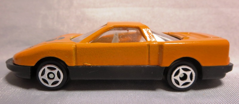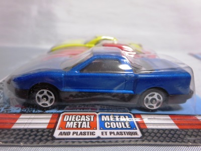 | 2001年9月に100均ショップのダイソーで購入。5台セットの価格で、モールドは超甘い。中国製。全長75mm。 | 2004年9月フランスのコレクターより入手。オレンジの車がNSX。ボンネットに「9」、ルーフに「GTB」のタンポ。中国製。ダイソーで購入したミニカーと同じ型。 | ||