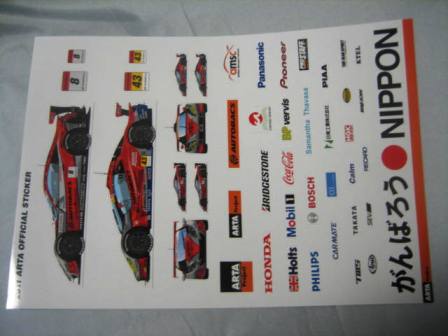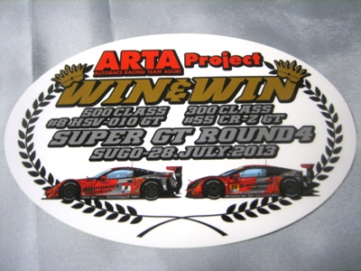 | 2009年スーパーGT最終戦に てホンダファンシートの観客にマフラータオル(これは第1戦でも配布)とメッセージカードとセットで配布。07年のARTA NSXダブルタイトル獲得記念ステッカーと同じ形式で画像は台紙のもの。2ツ折りの台紙のサイズは12.8p×18p。 中に収められる楕円形のステッカーの幅は13.5cm。 | |