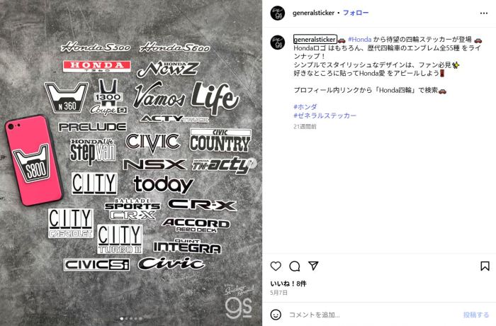 2025年9月4日にヤフオクで購入。 ステッカー類は材料と機材さえあれば素人が簡単に作成できるために、個人制作のホンダ未承認と思われる商品が大量にヤフオクやメルカリに出品されている。 気に入りさえすれば、そのへんはあまり気にせず購入してしまう方なのだが、2025年8月頃からヤフオクへの出品が始まった、これらのゼネラルステッカー製2種もなんとなく気に入って購入。 今回の購入価格は送料込みで1枚470円だったが、ヤフーショッピングでは1枚330円+送料200円で販売されている。 会社名っぽいものを名乗った個人販売が多い中、購入後に調べてみたら、このゼネラルプロダクツは1999年創業のしっかりした会社で、ホンダのライセンスも取得済み。 素材はいずれも耐水、耐光性に優れた塩化ビニール製で、サイズは、NSXが18mm×103mm、NSX-Rが16mm× 103mm。 それまで販売されていた2輪シリーズに、2025年5月7日に追加された4輪シリーズに含まれる今回の商品だが、ゼネラルステッカーではホンダ関連の商品だけで70種以上もある。 |
