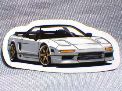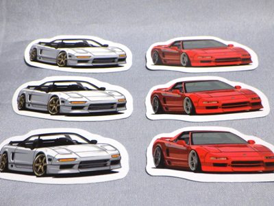 NSX VTEC SPEEDは2017年1月8日発売。2017年12月入手。 3サイズあり、Sサイズは高さ2.5cm×横9.1cm(500円)、Mサイズは高さ3.1cm×横11cm(600円)、Lサイズは高さ4.1cm×横14.8cm(1,000円)。 NSX改は2016年8月27日発売。2017年12月入手。3サイズあり(台紙のサイズではなくステッカー自体のサイズ)、Sサイズは縦9.1cm×横4.9cm(500円)、Mサイズは縦11cm×横5.9cm(600円)、Lサイズは横14.8cm×8cm(1,000円)。 これらのステッカーもuk氏の作品で、耐水・UVカット耐候・強粘着。共にSサイズを購入。 |