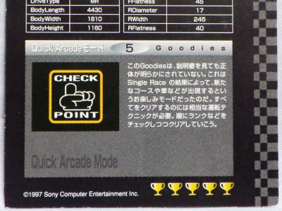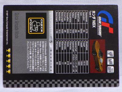 | ブルーのTypeSzeroのカード。裏面は087、088同様にクイックアーケードモード攻略アドバイス。 | ルマンに出場したNSX-RのGT1 TURBO仕様。裏面はグランツーリスモモードでの「賞金稼ぎ」。 | ||