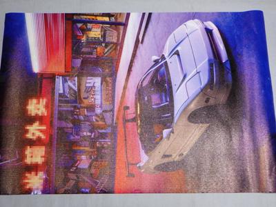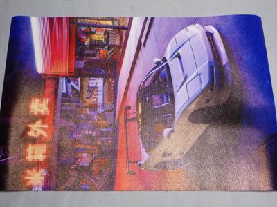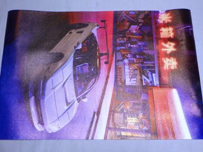 | 2010年2月ヤフオクにて入手。サイズは76×106cmと大きく、厚みも3mmとしっかりしたもの。ディーラーで後ろからライトを当てディスプレイされていたもの と思われる。左の画像も後ろから蛍光灯を当てて撮影している。ポスターに同デザインのものがある。 | |||