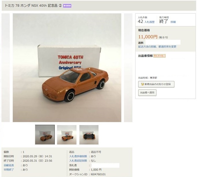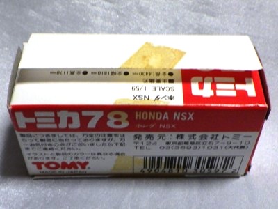 2020年5月29日に3種の「トミカ40周年記念NSXトミカ」(6-20ベース、6-43ベース、6-46ベース)をヤフオクに出品された東京の方が、2020年6月28日に、さらにトミカリミテッドベースとホンダレーシングコレクション(ルマン84号車仕様)ベースの「トミカ40周年記念NSXトミカ」2種を追加出品された。 いずれもまったく未知のモデルで高騰を心配したのだが、オークション期間の設定が24時間に満たなかったこともあって、何とか2台とも落札に成功した。 このモデルはトミカリミテッドベース(トミカリミテッドはトミカプレミアムほど力は入っておらず、基本は78-6のままなので78に分類している)。 |