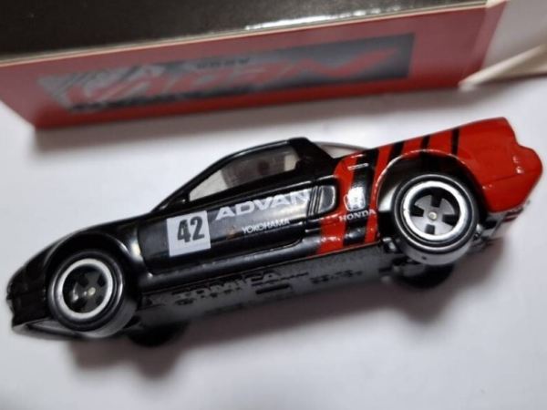 上記のマルティニ仕様NSXトミカと同時に同じ方から2024年10月に同時に入手。 トミカコレクターの方なら、アドバンNSXトミカと聞いてまず思いつくのは、東京巣鴨の有名ミニカーショップ「ガリバー」が特注した「ADVAN BP NSX 1996 ALL JAPAN GRAND TOURING CAR CHAMPIONSHIP KENWOOD #100」であろう。 1996年の下旬頃に発売されたモデルで、今でも根強い人気があり、ヤフオク相場も高め。 しかし、それに負けないくらいの相場を誇っている同様の商品が流通している。 それがこの海外の2次加工品と思われるモデルで、78トミカベースのNA1アドバン仕様と、81トミカベースのNA2アドバン仕様が、2017年12月にヤフオクに初登場している。 1万円を超える価格に当時は手が出せなかったが、宮城県の出品者の方のコメントによれば、ホビーショーで購入したもので、Mtnmodelが製作したものとのことであった。ゼッケンナンバーは共に「25」だった。 81ベースは2020年11月にもヤフオクに登場。ゼッケンナンバーは忘れてしまったが、出品から僅か1日で即決価格の25,000円まで上昇し落札されてしまった。 そして2019年2月には、43トミカベースのNC1アドバン仕様がヤフオクに登場。 某コレクターがパッド印刷で製作したものとのことで、40台限定の19号車と22号車、60台限定の96号車と100号車の4種が存在し、さらにツヤありとツやなしバージョンが存在していた。 このモデルはいくつか入手することができたが、CREATIVEというブランド名らしきロゴの入ったパッケージ付きだった。 ところが、2021年2月に、NA1、NA2と同様の「アドバンNEOVA」のロゴ入りパッケージに入ったNC1の出品が始まる。 ミニカー自体はCREATIVE製のものと同じに見えた。 2021年2月と2023年3月に登場したモデルのゼッケンナンバーは「96」で、2021年の6月と7月、2022年の1月と6月と8月に登場したモデルのゼッケンナンバーは「100」であった。 今回の入手品は「アドバンNEOVA」のロゴ入りパッケージに入ったNA1で、ゼッケンナンバーは「23」。 希少性はよく分からないが、入手するまで全く未知だったマルティニ仕様NSXより落札価格は上だった。 ガチなコレクターの方には、やはりそれなりの価値が認識されているようである。 2025年7月24日にゼッケンナンバー「42」が初登場したが落札できなかった。 |
