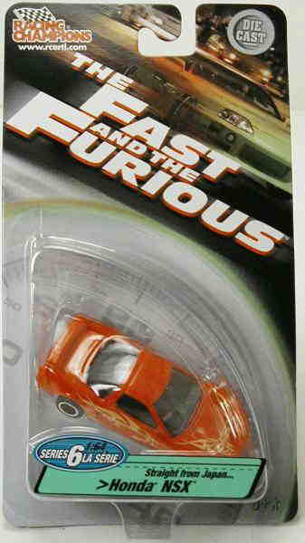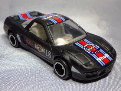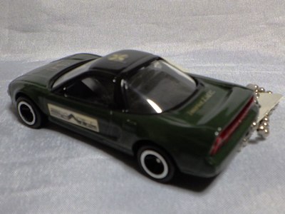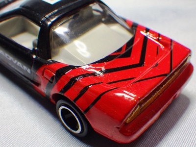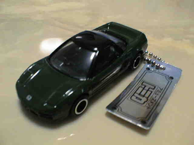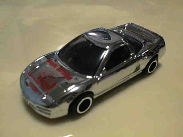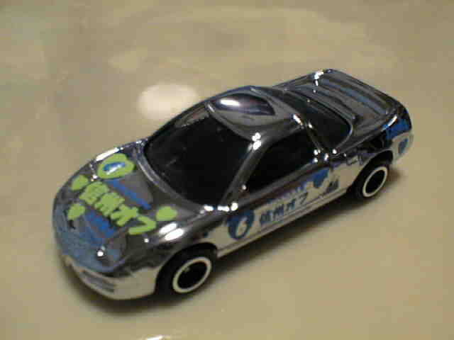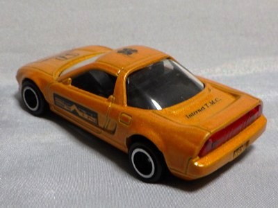 「THE FAST AND THE FURIOUS」 2003年5月末にアメリカ・アーテルより発売されたレーシングチャンピオンズ「THE FAST AND THE FURIOUS」シリーズ第6弾6車種の中のNSX。「THE FAST AND THE FURIOUS」は2001年10月に「ワイルドスピード」という邦題で日本で公開された映画。エクリプス、RX-7、スープラといった日本のスポーツカーがフルチューンされて街中を爆走する話で、なかなか面白い作品でした(NSXは劇中に登場していませんでしたが)。これが実は、まんまトミカで、目を引くボディいっぱいのファイヤーパターンのみならず、サイドにはチューニングメーカーのロゴが細かく入っています。ネットオークションにもドッと出て、私もアメリカ在住の出品者から購入しました。ミニカーマガジン03年7月号にも紹介されているように、トミカがベースになっているのはランエボWと、このNSXのみのようです。今後同シリーズにトミカベースの車がリリースされる可能性は大きいと見ていましたが、03年8月に公開されたパート2に一瞬登場したNSXが12月上旬にモデル化されたものは、トミカではなくなっていました。劇中のマシンが派手すぎてトミカでは限界があったようです。こちらのモデルは「11.その他のミニカー」のページで紹介しています。 |