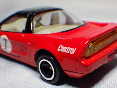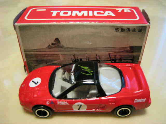 Hマークは白色タンポ。フロントウインドーに「HONDA NSX」、サイドに「FHONDA NSX Castrol」と白色タンポが入る。2014年12月ヤフオクにて入手。 感動倶楽部が特注したNSXトミカは、前述したように5タイプ存在する。ゼッケンナンバーPP65がタンポされた78-6-16、ナンバーのないゼッケンの枠のみがタンポされた78-6-9A、その78-6-9Aのルーフに某F1ドライバーのサインをタンポした78-6-11B、ゼッケンナンバー7がタンポされた78-6-10、その78-6-10のルーフに某F1ドライバーのサインをタンポした78-6-11である。 78-6-10と78-6-11との違い同様に、78-6-9にもルーフにサインのあるタイプとないタイプがあるのだが(当サイトでは9A、9Bと呼称する)、なぜかトミカの分類を行っている大御所コレクターM氏はこれを分類していない。ルーフのサインの版権問題が絡んでいると思われる。トミカ関連のムック本では78-6-11の詳細が非公開になっているのだが、M氏に以前伺ったところによると、これもサインの版権問題とのことであった。78-6-9Bのサインありモデルについては、詳細を非公開にするくらいなら最初からナンバーを与えないでおこう(なかったことにしておこう)という判断になったのかもしれない。 最近ではヤフオク相場も下がり、2020年に入ると5月16日に出品されたものが31,500円で落札されている。 |