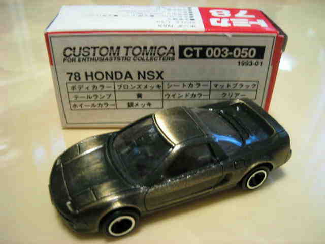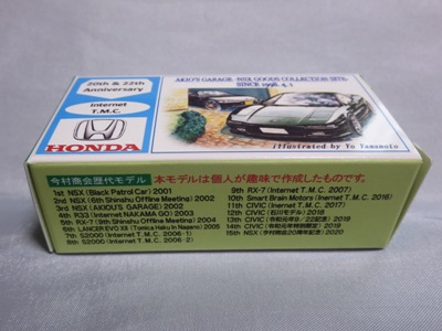 全15種の中の、私一推しのモデルがこの銀メッキバージョン。 20年近く前に、今村商会さんとのコラボでNSX生誕10周年トミカを製作したときに、また将来このようなモデルを作りたいと考え、「そのときに使うベースモデルはこれしかない!」と心に決め、コツコツ集めていたのが、この銀メッキトミカだったからである。 図らずもドリームボックスさんから「NSX生誕30周年記念トミカ」を一緒に作りませんかと声をかけていただき、ついにそのストックを使うときが来た。本当に感無量である。完売できなかった場合、私が責任を取ってドリームボックスさんから全て買い取るつもりだったのだが即完売した模様。 私のわがままを聞き入れてくださったドリームボックスのA氏、このモデルをお買い上げくださったコレクターの皆様には本当に感謝しかない。 |