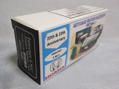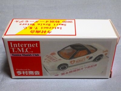 2020年2月1日より今村商会の公式サイトで受付が開始された今村氏の手による20周年記念シール貼付サービス(有料・価格は非公表・スマートブレイン仕様も同時に受付)に申し込み、1か月以上かけて送付するベースモデル39台を厳選し、4月4日に送ったものが、作業を終えて2020年4月19日に30台がまず戻ってきて、5月12日に残りの9台が戻ってきた。このモデルは第2陣として届いた9台のうちの1台である。 78-6-30アミューズメントモデルをベースとしたゴールドシール仕様である。 箱には今村商会オリジナルトミカ第6弾のイエローのS2000の画像がプリントされ、その反対の面には、当サイトのトップページのイラストを使用していただいている。 ゴールドシールは、市販モデルNo.6に使用されているものと同じ。 アミューズメントベースは、20周年記念カスタマイズモデルでも、スマートブレイン仕様でも、過去にヤフオクに出品された記録はない。 |