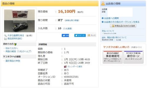 」という名称で出品されていた。 石川県から出品されたこの商品は12月31日に15,150円で落札された。 2020年1月2日に同じ石川県の別の出品者から再出品され1月5日に10,520円で落札された。 2020年1月14日に兵庫県から3度目の出品があり1月14日に 落札し、やっと入手できた。 2020年1月19日に石川県の出品者から4度目の出品があり1月26日に5,751円で落札された。 |