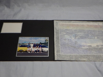 | ▲1冊目の右ページの写真は別のイベントの写真が挟まったもの。実際には左ページの左上と同じ写真が引き伸ばされて収まっている。左ページの集合写真には講師のガンさんこと黒沢元治さんが写っている。一番下の画像が右ページの上に重なっていた別イベントと思われる写真。車両は同じ神戸ナンバーのNSX。 | ▲こちらが2冊目。左ページ左上の写真は、オーナーの方が記念に抜き取ったのか最初からなかった。こちらの集合写真にもガンさんが写っている。右ページのオーナーのお顔は加工している。出品者によれば、この3点の商品はオーナーから譲り受けたものとのこと。 |