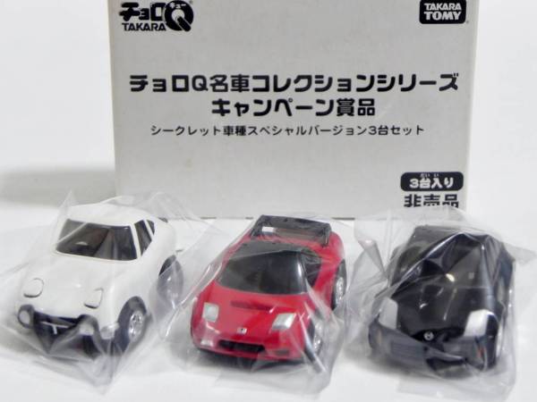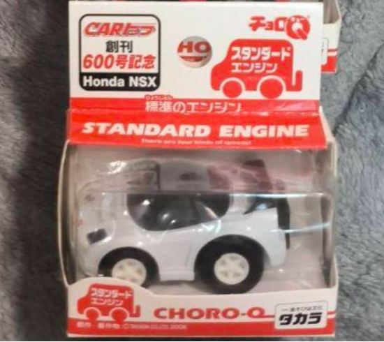 チョロQ(CHORO Q) ここではタカラのチョロQのNSXコレクションを紹介しています。2次加工モデルとしてはグッズ製作会社「プログレッサ」製作の物が多数存在します。みちのくプロレスの限定グッズとして試合会場で販売されたり、抽選賞品として配付されたりしていたようです。車種も多岐にわたり、NSXだけでも100種を超えているので(おそらく150種くらい)全車種合わせると軽く1,000種以上はあるのではないでしょうか。まさにコレクター泣かせのアイテムとなっています(タカラに無許可で2次加工品として販売したため裁判沙汰になったという話もありましたが、その後どうなったのでしょうか…)。 チョロQは、かなり後になって手を出したアイテムなので、「チョロQ大図鑑」(ネコパブリッシング・税込¥2,000)で勉強。VOL.1は1980〜86年までのモデルを完全網羅しているのですが、NSXは1990年以降の商品のため現行品をチラリと紹介しているだけ。VOL.2にはしっかり紹介されているので参考になります。 2001年8月、ヤフオクをにぎわした「モービル1NSXチョロQ」。以前特注モデルとして企画されながら発売されなかったモデルだけに、ヤフオク登場と同時に相場は2万円以上に高騰。しかし、8月のモービル1フェアのオイル交換時の景品であるこの商品は多くの人によって次々に出品され、数日後には早くも6,000円前後に値崩れ。1週間後には3,000円台に。プルバック機能はあるもののタカラ製チョロQではなく、裏面にタカラの刻印の代わりに中嶋レーシングのロゴの刻印のみ。ボディ、ホイールともに今まで発売されているどのNSXチョロQとも異なります。11月には1個100円で販売しているカーショップもあり、その後は100円でも買い手が付かない状態となりました。2002年5月にはパッケージをブリスターパックに変更し、中身もリニューアルして再びキャンペーン商品として配布されました。さらに秋には第3弾としてリアハッチエアインテーク付きの'02後期型にモデルチェンジ。10月1日〜11月30日の期間にオイル交換に5,000円以上かけたお客さんに配布されたスクラッチくじの商品でした。これらも安く入手可能です。 2002年6月22日、「全日本GT選手権2001シリーズセットラウンド2」(10,000円)が発売。セット内の10台の中で、NSXは前年に無限限定セットに入っていたロックタイト無限NSX1台のみ。これで両者がまったく同じ物だとつまらないのですが、一応微妙な違いがあります。以下参考までに。