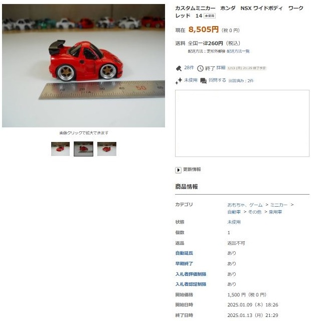▲2021年9月8日にヤフオクに初出品された「オリジナルチョロQ モチュール無限NSX-GT SUPER GT GT500 2017 No.16」。入札もしたが予想以上に高騰して脱落。
