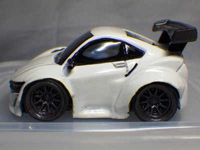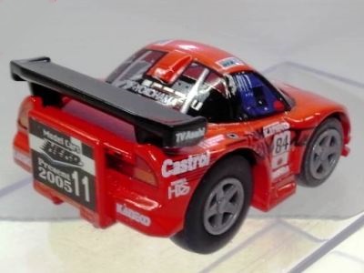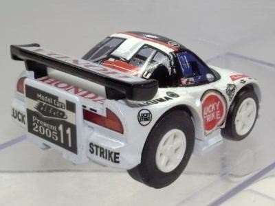 | 2002年12月28日発売。全12種の中に通常品のNSXレーシングの色替えモデル(黒)がラインナップされた。ブラインドパッケージ仕様の商品だが、薄いアルミ袋入りなので手触りでピンポイント購入が可能であった。車高の低さと、ごついリアウイングが見分けるポイント。 | |||